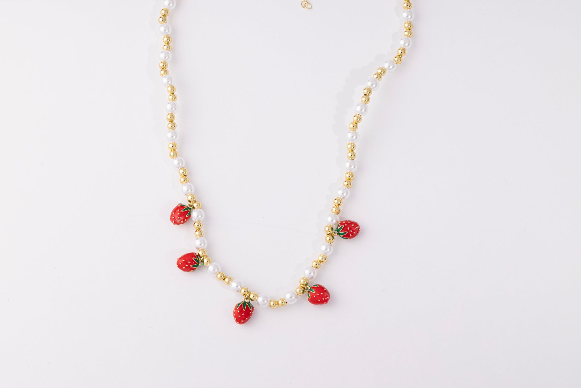Un diseño encantador que combina el brillo de las perlas con el toque divertido de pequeños charms de fresa esmaltados en rojo con detalles dorados.