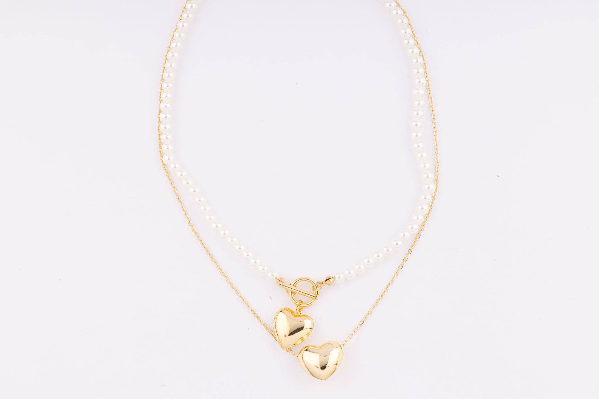 Un conjunto que desborda amor y estilo ✨. Dos collares complementarios + aretes: uno con un corazón sólido y brillante, y otro con perlas delicadas y un dije de corazón con cierre tipo barra, ideal para destacar sobre cualquier look.