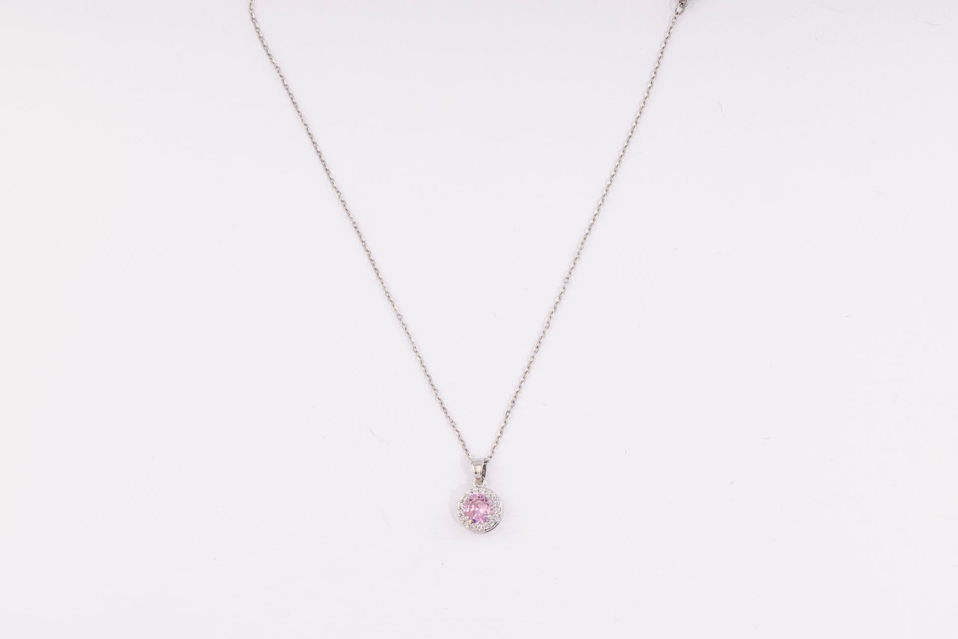 Este set incluye un collar y aretes con cristales rosados rodeados de destellos plateados que reflejan elegancia y dulzura.