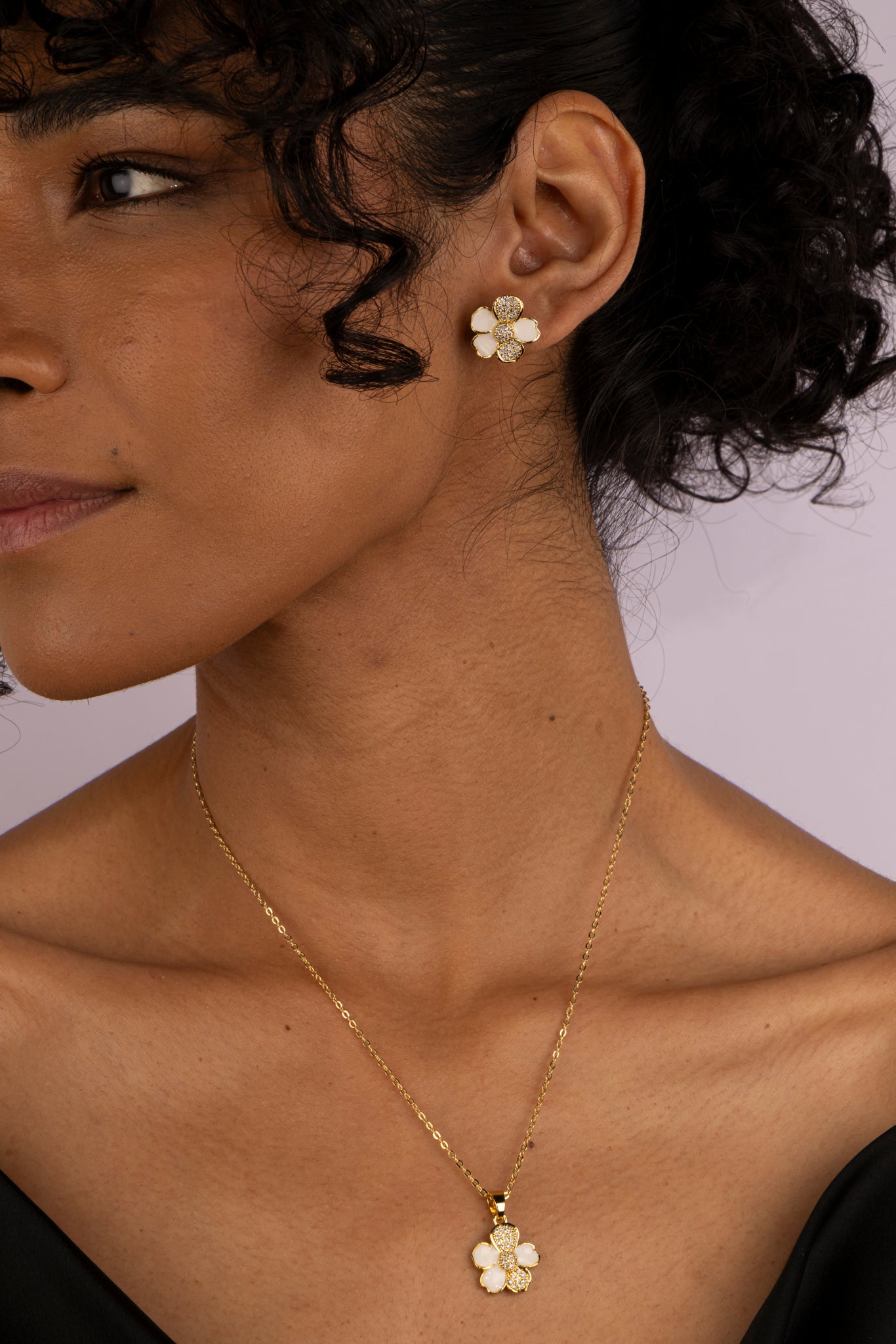Delicado, femenino y lleno de luz ✨. Este set incluye un collar y aretes en forma de flor con pétalos nacarados y cristales brillantes que reflejan elegancia natural. Ideal para darle un toque romántico y sofisticado a cualquier look 🌼.