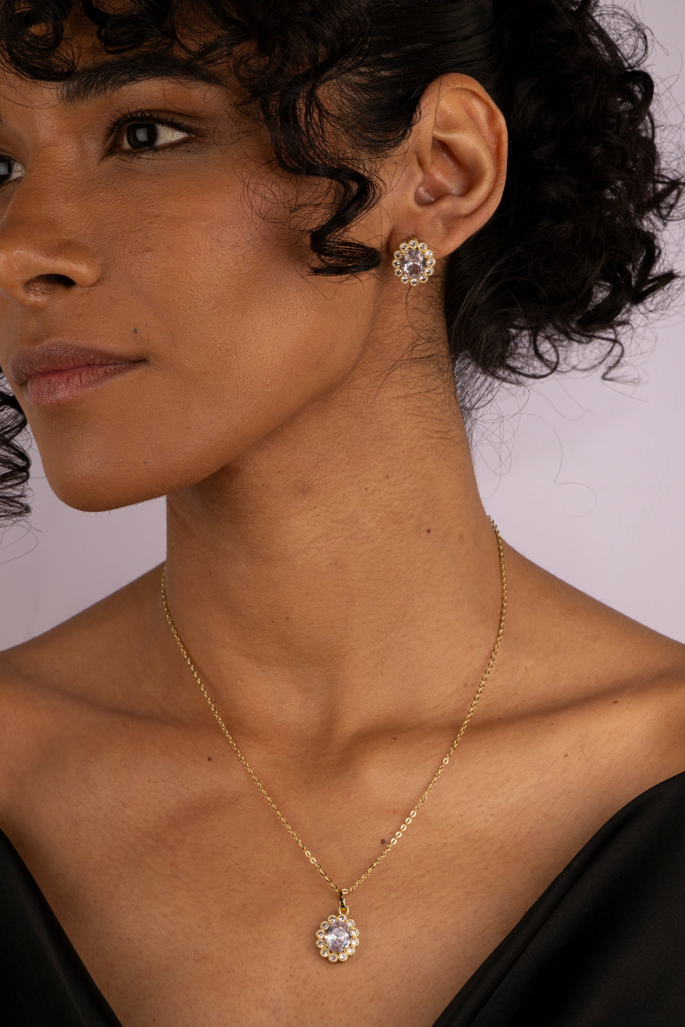 Un clásico que nunca pasa de moda ✨. Este set combina un collar y aretes dorados con cristales ovalados rodeados de pequeñas gemas que aportan un brillo sofisticado y atemporal. Perfecto para ocasiones especiales o para elevar cualquier outfit con un toque de lujo 💫.
