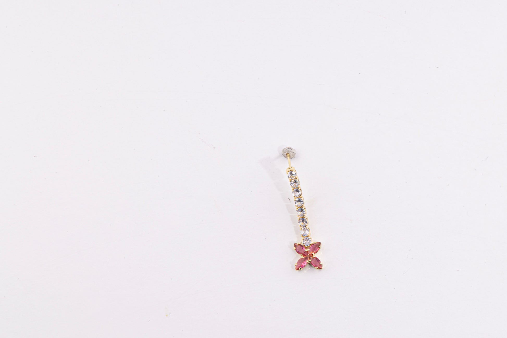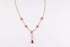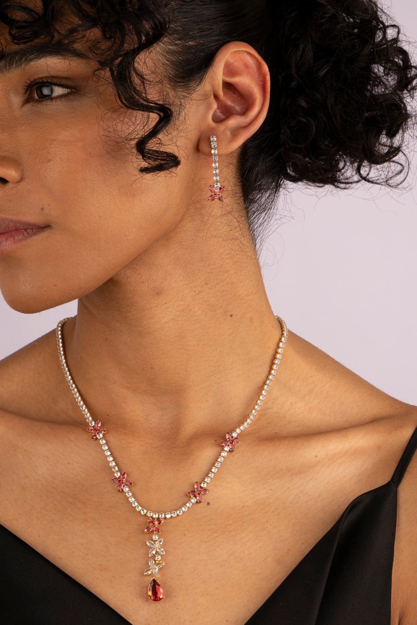 Un diseño inspirado en la delicadeza de la naturaleza. Este set combina flores en tonos rosados y amarillos con un toque de brillo multicolor que aporta vida y elegancia. El collar, adornado con una lágrima roja en el centro, se complementa con aretes florales que reflejan la luz con cada movimiento.