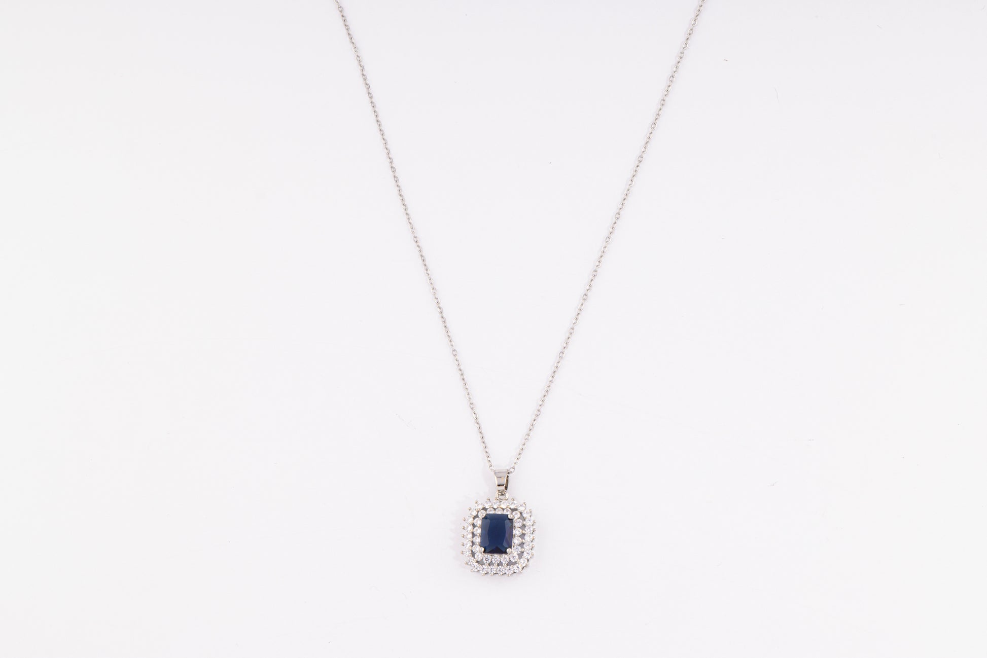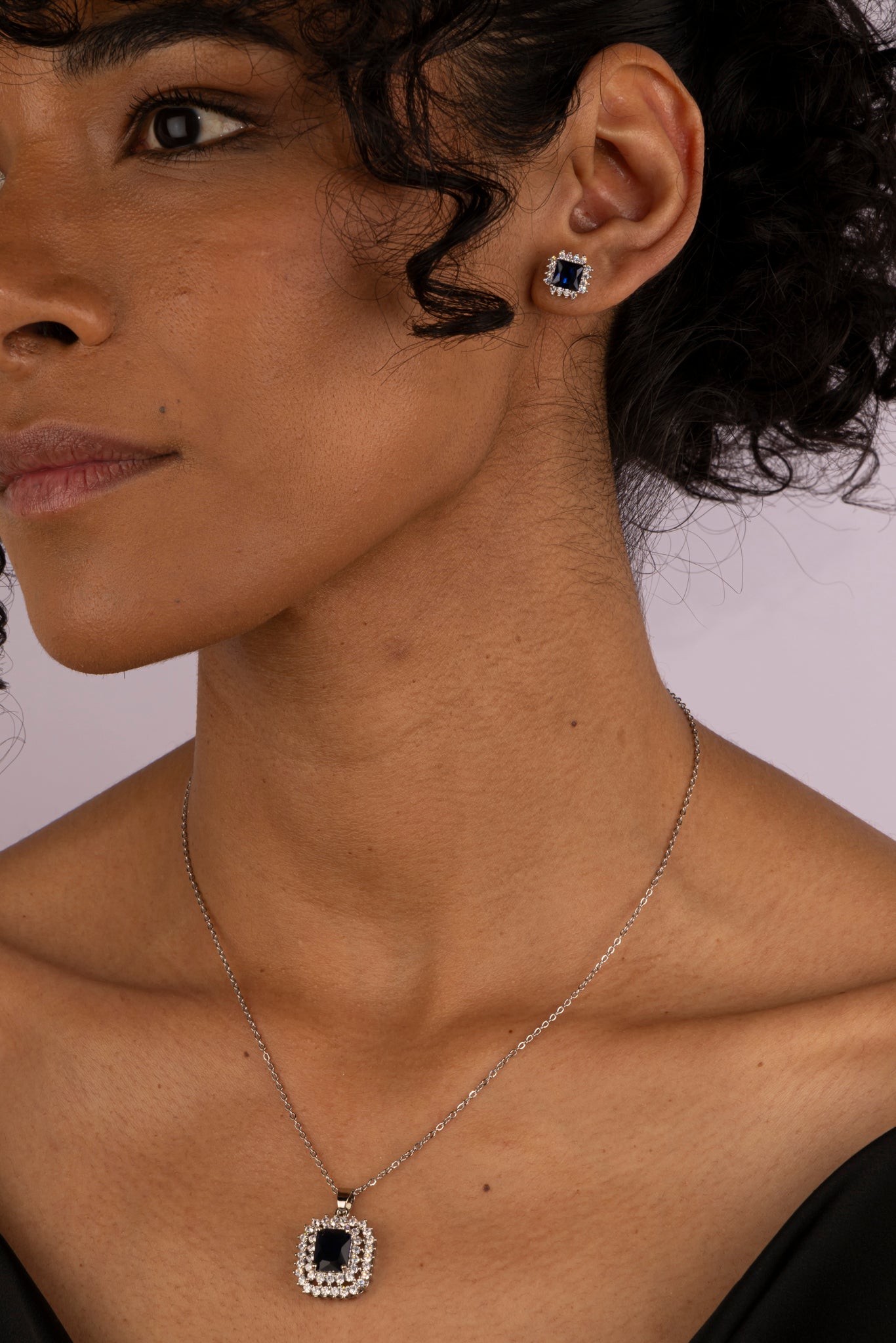 Inspirado en la realeza, este set cuenta con un collar plateado con piedra central azul marino y aretes a juego, rodeados de cristales que aportan profundidad y brillo. Una joya elegante que nunca pasa desapercibida.