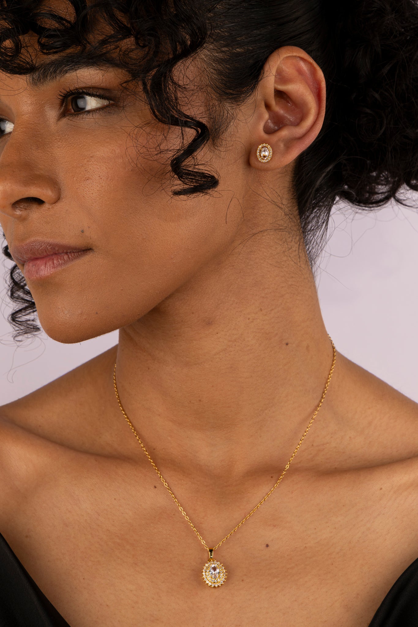 Este set incluye un collar dorado con piedra central tipo diamante y aretes a juego, rodeados de cristales que reflejan la luz con un brillo puro y atemporal. Perfecto para resaltar cualquier outfit con elegancia.