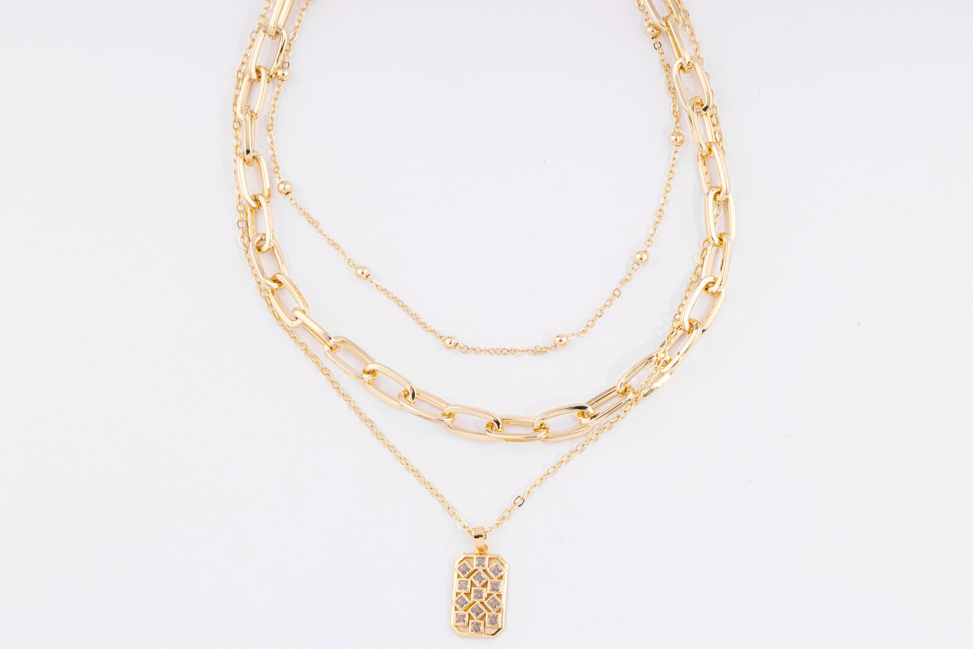 Es pura elegancia con actitud. Compuesto por tres collares dorados en distintos estilos, destaca un dije rectangular con incrustaciones de cristales que reflejan lujo y carácter.