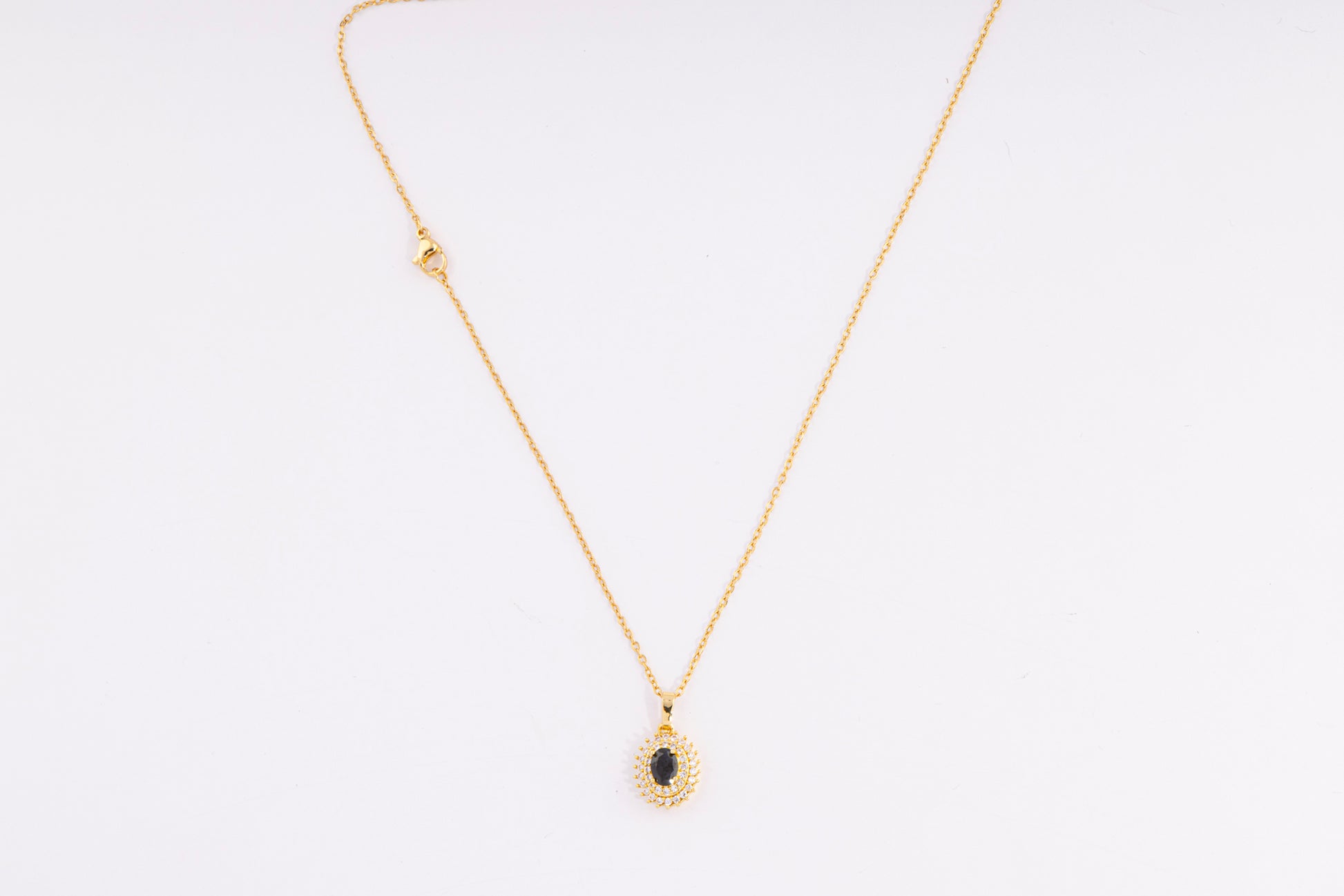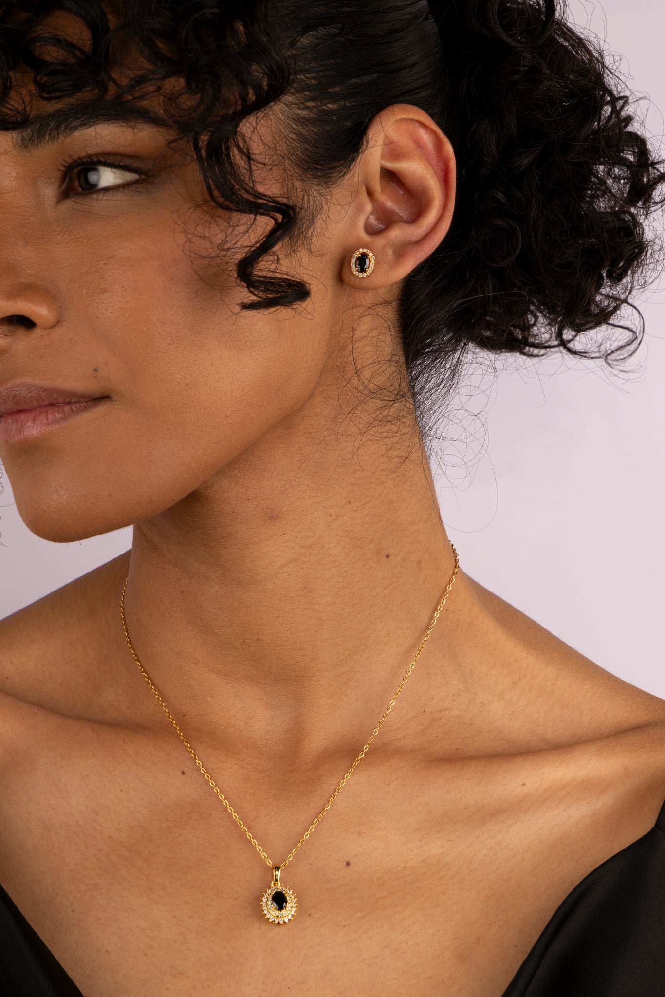 Este set incluye un collar dorado con piedra central negra y aretes a juego, rodeados de cristales brillantes que crean un contraste elegante y poderoso. Ideal para un look sofisticado y con carácter.