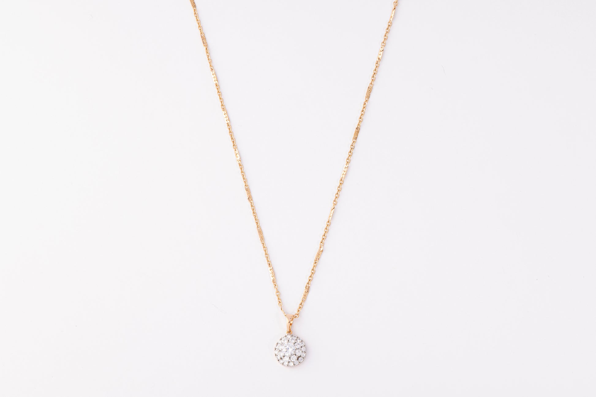 Un dije redondo completamente cubierto de cristales que refleja la luz desde cada ángulo.