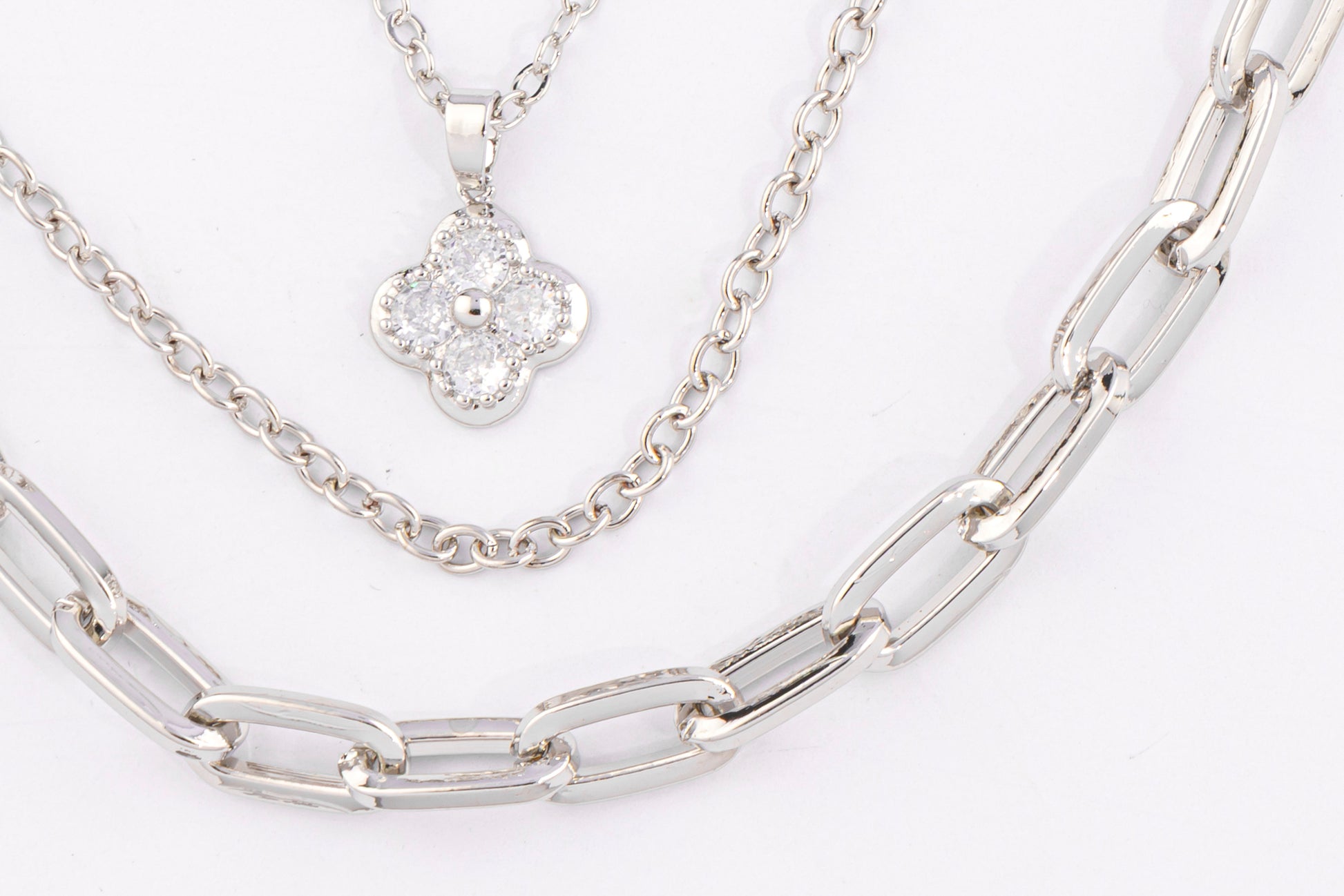 Triple capa en tono plateado con combinación de cadena fina, cadena mediana y eslabón tipo paperclip. El dije central es un trébol brillante que aporta un toque delicado y elegante.