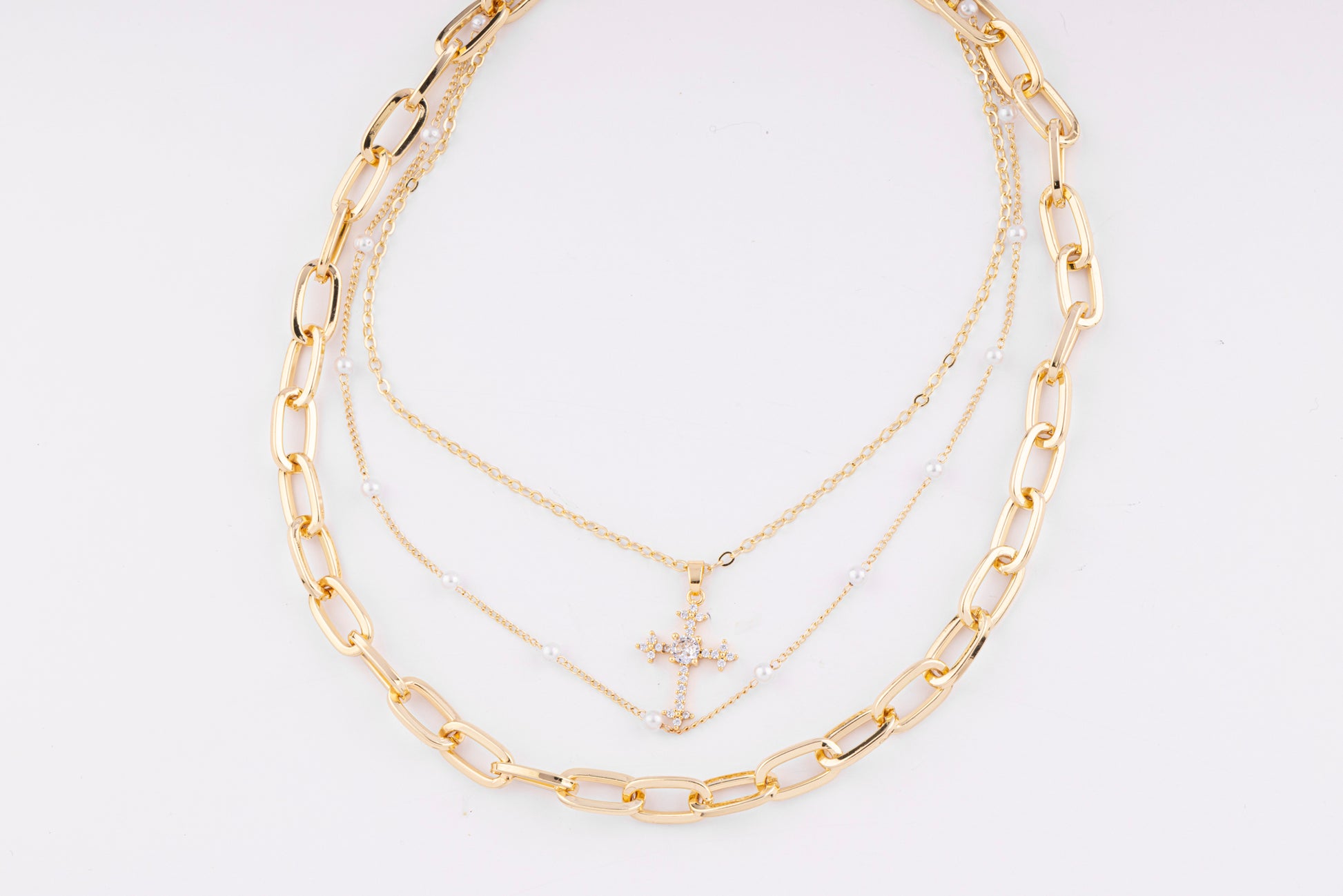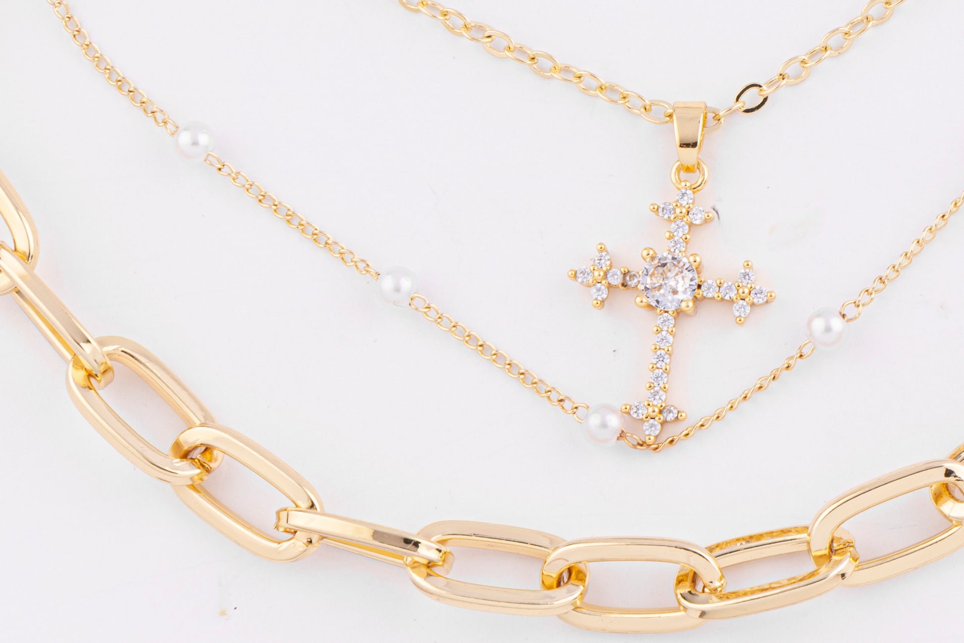 Un collar de tres capas que combina eslabones gruesos, cadena fina y una capa intermedia con perlas delicadas que enmarcan un dije de cruz lleno de brillo.